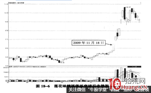 图18-5为此股涨停板突破当日(2009年11月18日)的分时图,从图中可以看到,当日此股早盘呈现出一次强势的快速封牢涨停板形态,主力做多意愿坚决。在通过每笔均量的异动提前查知此股的主力大力建仓行为之后,我们就应在此股涨停板出现前做好抢涨停板的准备,因为我们的这种抢涨停板操作是有前期的每笔均量异动来作为保障的,因此其成功率较高、风险则相对较低。图18-6为此股随后的走势图,从图中可以看到,此股在2009年11月18日后仍是以强势上涨为主基调。