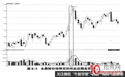 图8-3为此股涨停双阳形态出现后的走势图,从图中可以看到,随后此股出现了一波幅度较大的调整,而且在随后较长一段时间内都失去了再度突破上涨的动力。涨停双阳形态对个股持续上涨的破坏作用可见一斑。