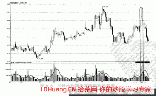 图8-8为三峡水利(600116) 2009年3月23日至2009年9月30日期间走势图,此股在反弹至前期盘整密集区附近时出现了一个涨停双阳形态,这顶示着这一波的突破上涨已告一段落,是其随后即将展开回调走势的信号,也是我们短线逢高卖出此股的信号。但对于中长线的操作来说,由于这两日的量能相对于前期放量,并没有出现明显放大,因此主力即使有逢高抛售行为,其力度也不大,我们不必在中长线上盲目做空,当此股回调至相对低点位后,也可以展开积极的买入布局操作。
