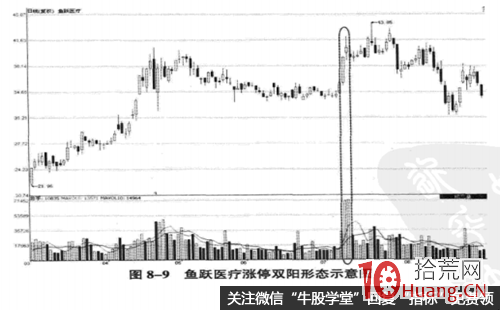 图8-9为鱼跃医疗(002223) 2009年3月3日至2009年8月31日期间走势图,此股在相对高位区盘整走势后以一个涨停双阳放量的形态呈现。然而,这种形态是无法完成突破的,它预示着一波回调走势的展开,也是我们短线卖出此股的明确信号。