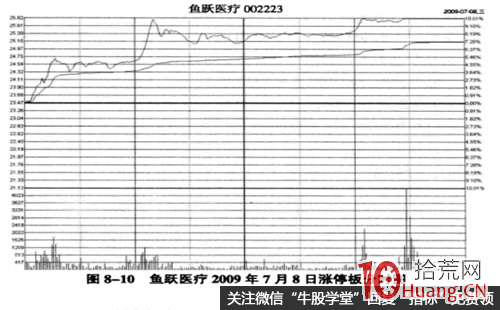图8-10为鱼跃医疗(002223)涨停双阳第一日中的涨停板分时图(2009年7月8日),从图中可以看到,此股当日封涨停板的时候在尾盘,而且上封涨停板后仍出现了较大的成交量,这说明有资金在借机出逃,因此这一涨停板形态下的个股,其阶段性的上涨势头是难以维系的。