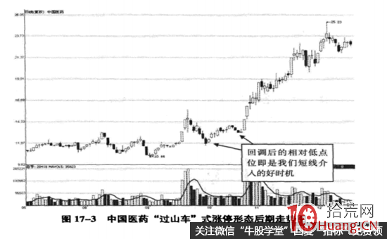 图17-1为中国医药(600056) 2009年2月6日至10月22日期间走势图,此股在长期的盘整走势后,于2009年9月17日、2009年9月18日两日连续涨停突破前期盘整区,上冲势头十分强烈,但同期的大盘却出现了一波快速下跌走势。