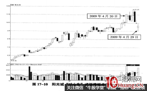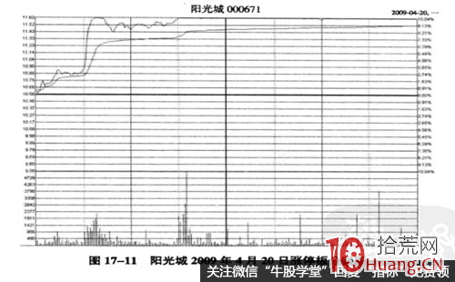图17-10为阳光城(000671) 2008年12月30日至2009年4月29日期间走势图,此股在2009年4月20日以一个涨停板形态突破了前期的盘升走势。