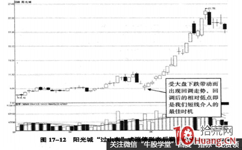 从图17-12中我们可以看出,在2009年4月20日至4月29日期间,大盘出现了一波明显的回调下跌走势,由于这种回调是受大盘下跌所影响,而且大盘的这种局部下跌仅仅是一时性的回调走势,大盘整体仍处于稳健的上升通道中,因此在实盘操作中,我们可以在此股回调后的相对低点择机买入。