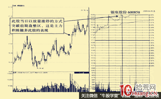 如图所示,为银座股份(600858) 2009年6月5日前后走势图,此股在2009年6月5日以一个放量涨停的形态突破前期盘整区,考虑到此股目前仍处于中长线上的低位区且前期保持了良好的震荡盘升形态,我们可以把这一个涨停板看作是主力强势做多此股的表现。拾荒网你的炒股专家