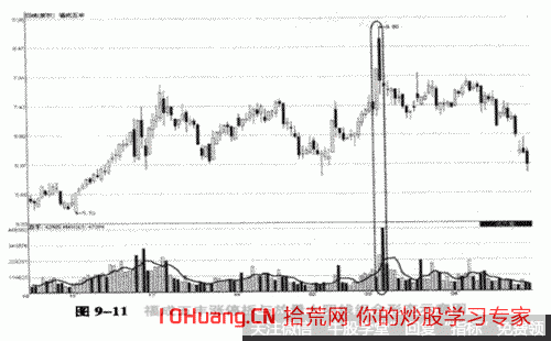 图9-11为福成五丰(600965) 2009年10月15日至2010年4月30日期间走势图,此股在上升途中的震荡盘整走势之后出现了“涨停板+放量大阴线”的组合形态,这一形态的出现个股突破上涨受阻、市场抛压沉重的表现。在实盘操作中,这种形态并不是我们短线介入的信号,它反而是持股者逢高出局的明确信号。