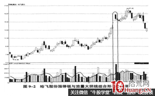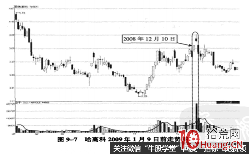 图9-7为哈高科(600095) 2008年7月30日至2009年1月9日期间走势图。此股在经历了2008年的深幅下跌后,于低位区出现了止跌回升的走势,在经过一波反弹上涨后,此股在阶段性的相对高位区出现了横盘震荡走势,随后的突破性涨停板说明此股有再度上攻的倾向,但是涨停板次日却出现了一个放量大阴线,这说明市场短期抛压沉重,是一波回调走势即将展开的信号。