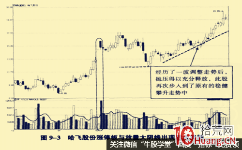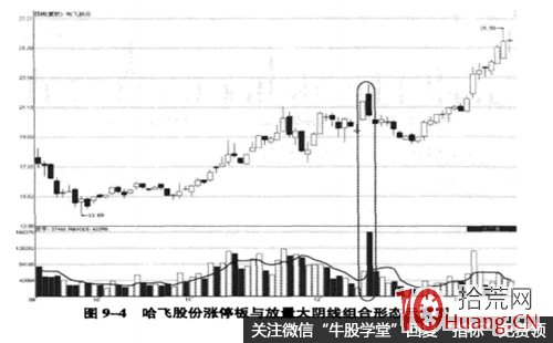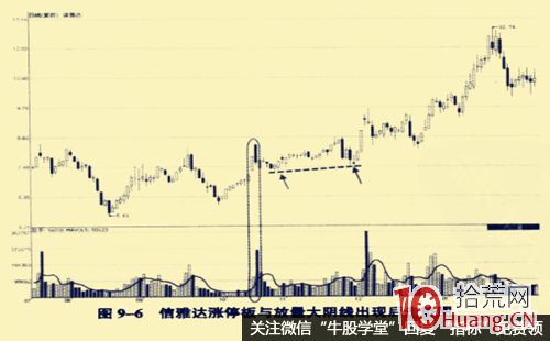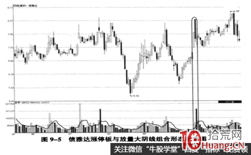 图9-3中此股在经历了“涨停板与放量大阴线”后的一波明显回调走势后,这使得市场短期内的做空动能得以充分释放,随后可以看到,此股再次步入到了原有的稳健攀升走势中。可以说,“涨停板与放量大阴线”的组合形态虽然在局部上改变了个股的走势,但是从整体走势上来说,它并没有破坏个股的趋势运行状态。