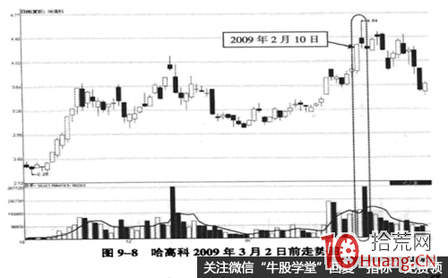 图9-2为哈飞股份(600038) 2008年10月24日至2009年3月2日期间走势图,此股在此期间处于稳步攀升走势中,随后,此股由于受一则利好消息刺激而出现了一个无量涨停板:“哈飞股份:拟出资1500万美元参股设立复合材料制造中心(占10%);制造中心合资合同的签署标志着哈飞与空客的工业合作关系取得了历史性突破,哈飞与空客巳经缔结成为利益共同体,共享发展成果,共同面对当前世界经济衰退给航空工业带来的严峻挑战,今后将进一步促进和拓展双方战略合作。”这使得个股的涨势开始加快,但是在无量涨停之后,个股出现了一个代表市场抛压极其沉重的放量大阴线形态。