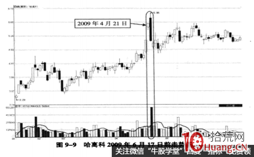 图9-9为哈高科(600095) 2009年6月17日前走势图,此股在再度创出新高的突破性上涨走势中,再次出现了这种“涨停板+放量大阴线”的组合形态,结合此股之前频频出现的这种组合形态,我们可以很有把握地作出判断:此股的短期突破上涨走势再度宣告结束,随后的一段时间将以回调或是横盘震荡为主,因此在实盘操作中,对于短线投资者来说,可以把关注的重点对象放在那些短期强势股上,而此股更适宜展开“高抛低吸”式的阶段性买卖操作。