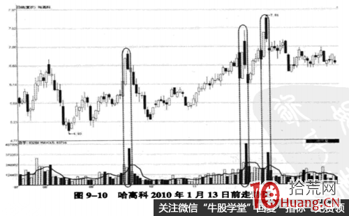 图9-10为哈高科(600095) 2010年1月13日前走势图,从图中可以看到,此股的震荡上涨走势中,多次出现这种“涨停板+放量大阴线”的组合形态,虽然每次这种形态都使得个股创出了新高,但是每一次这种形态也都预示了随即展开的一波回调走势。在实盘操作中,当我们看到这种组合形态时,应适当地进行逢高减仓操作,以避免到手的利润随着股价的短线回调而快速缩水。反之,在此形态后的一波回调走势的相对低位点,则是我们逢低买入的好时机,毕竟这种放量大阴线并非是市场空方力量在整体上强于多方力量的表现,它并不会破坏个股原有的震荡盘升形态,只能在个股的阶段性走势上对其产生较为明显的影响。