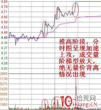 1、分时图走势攻击性强,上涨则快速拉高,同时成交量放大,在推高的过程中,一般呈现加速上攻的形态,而不是拱形上涨: