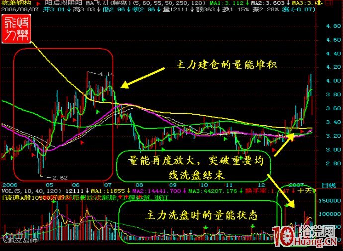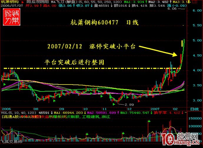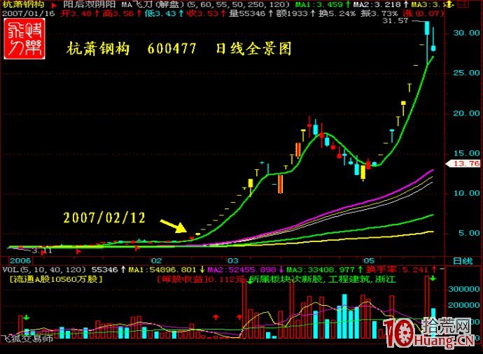 杭萧钢构于2005年7月21日见2.40元的历史低点后,构筑窄幅整理平台。2006年4月26日,该股主力放量拉高,加大建仓力度,于7月建仓完毕。之后,该股开始缩量洗盘,至2006年12月27日形成长达三个月的双底“散户坑”。次日,该股放量拉高,至双底颈线位。此刻,该股股性已经完全激活,“散户坑”大致完成。随后,该股振荡走高,形成“彩虹桥” 走势,随着“彩虹桥”形态的构筑完毕,股价迫近平台历史高点。次日该股早盘高开后,便直接放量冲击涨停,突破长达一年的平台整理,短线进入主升之路。当然,之后的11个涨停板给我们的是意外,惊喜。