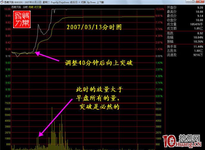 2007年3月19日,在加息消息的作用下,华菱管线大幅低开,直接开在13日均线附近,很好地完成了最后的洗盘动作并企稳。3月20日,冲高突破,然后回落。这并不是真正的突破,而是留下长长的上影线,表明主力一方面要洗出前期头部被套的筹码,让他们感到应该赶快出货,如果不出就有再度被套的可能;另一方面,给近期介入获利的股民有冲高见顶的错觉,同样是赶他们下车。3月21日,该股盘中长达三个小时的横盘振荡,继续清洗前期头部筹码和获利盘,不料最后一个小时,该股快速启动,在上影线里收出阳线,DIF开始腾空,主力突破欲望异常强烈。此时,应果断追涨,我们在收盘前10分钟左右敲单买入。次日开盘,该股跳空高开,站上头部,不给任何价位卖出者一点机会,横盘将近半个小时之后,便一口气冲击涨停,让我们不得不佩服主力的狡诈、凶狠和魄力。当然,更让我们高兴的是,我们自己不仅搭乘了主力的顺风船,享受到拉升带给我们的快乐,从而培养了我们良好的心态,同时还让主力给我们送了一个大大的红包,资金又拉出了长阳。