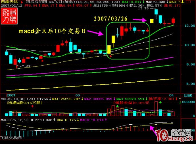 2006年3月26日,该股MACD第二次金叉运行到第9个交易日,当日没有击穿前一个交易日的低点,并且还比前一个交易日高点要高,时间周期到了,但是没有探到13日均线,就已经开始止跌,企稳迹象明显,可以积极进场参与,因此我们在当天介入该股。