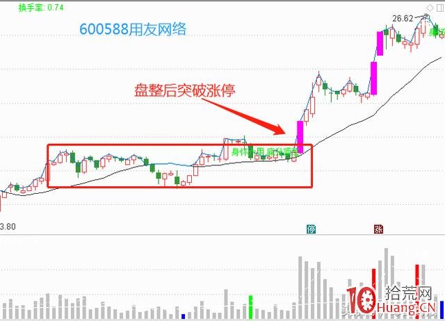 我们以600588用友网络为例,我们来看,股价经过一个盘整期,突然之间出现一个涨停,这就是大涨的号角,随后出现了一波连续上涨的行情。
