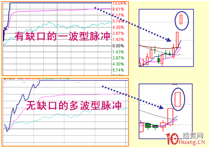2、对于脉冲型涨停走势,有时候与阶梯型走势相似,区别在于阶梯型的横盘时有较高的成交量,这是在主力诱导下的高位换手造成的,而脉冲型涨停的横盘往往是无量的,是市场的自然成交,主力一旦拉起股价便会一气呵成,少有停顿,以快速摆脱主力成本区。