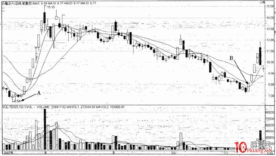 从图中可以看出,沙隆达从最高点15.15元,在69个交易日就跌到了A点前一天的7.2元,跌幅高达52%,而且涨停启动前,股价也很接近6.54元,也就是图中B点,这一前期重要的阶段性低点。通常在短期严重超跌和接近前期重要低点,这两种条件同时满足时,股票往往就会产生一波较较有力的反弹。而在沙隆达在此轮下跌以来的最低点的次日,轻轻松松拉出涨停乏后,此种观点就再次等到了验证。拾荒网,专注短线技术技巧进阶。