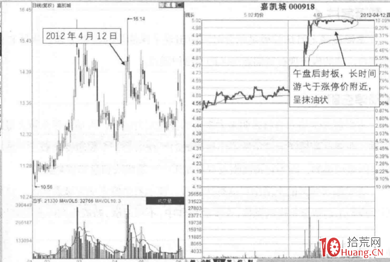 图为嘉凯城2012年4月12日分时图,当日午盘后,个股快速上冲涨停板,却并没有牢牢封板,股价长时间游弋于涨停价附近,既不明显回落,也不封死涨停板,这就是典型的抹油板。当日正处于宽幅震荡区上沿位置点,可以预见,个股是无力突破上行的。拾荒网,专注短线技术技巧进阶。