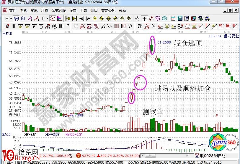 上面是盘龙药业从3月底到5月份的走势图,从图中可以看到,股价从3越低开始一直到4月初走出了一个非常牛的走势,如果单单的用走势“牛”来形容的话,显然已经不够了,只能说它走得非常妖才足以对得起它的妖性。上图只是简单的标注了当时的几个重要的点,其实具体的股票买卖如下: