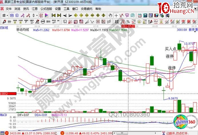 上图是新开源的2011年8月份的走势图,从图中我们可以看到,在底部出现了两天强势涨停,之后股价冲高回落,已经跌到了第二个涨停板的开盘价。这个股票在最后一根K线的时候是低开,并且在当天迅速的拉升向上,当股票拉升到最近的涨停价的时候就是好的买入时机,强势股回调到拉升前一个涨停时很有可能再次上涨,所以在短线上就可以做T+1了。