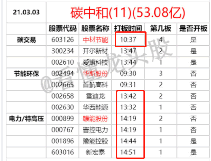 在3.3,前一天强势的碳中和开盘反而弱了,中材节能开板,大部分票断板,周期股又高潮,纯碳中和的晋级票基本是下午才跟着氛围回流。